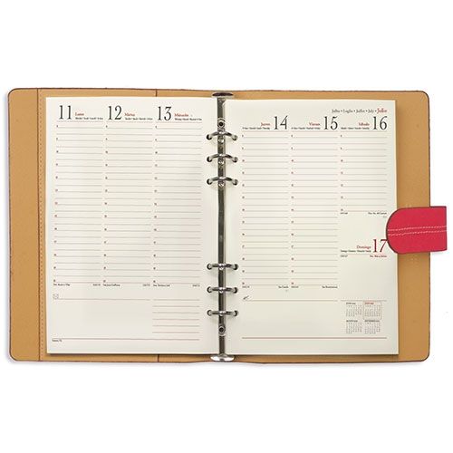 El diseño de la agenda semana vista de polipiel incluye un recambio semana vista en un elegante papel color crema, ideal para una planificación eficiente. Además, incluye festivos internacionales, direcciones y teléfonos de interés, calendario trienio y santoral, todo en seis idiomas: español, portugués, francés, inglés, alemán e italiano. Con unas dimensiones de 17.5 x 23.5 cm y un peso de 232 gramos, es compacta y fácil de llevar. Viene en una caja de presentación, lo que la hace perfecta para regalar.