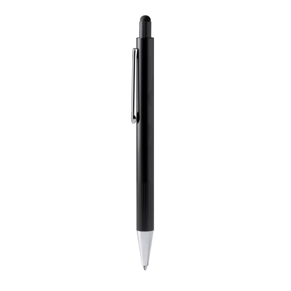 El bolígrafo de aluminio con puntero es la opción perfecta para quienes valoran la combinación de diseño sofisticado y funcionalidad. Su estructura en aluminio reciclado garantiza durabilidad y un tacto premium, mientras que el acabado metálico y el agarre rayado ofrecen una experiencia de escritura cómoda y segura. Gracias a su puntero táctil, este bolígrafo es ideal para profesionales, estudiantes y cualquier persona que utilice dispositivos móviles a diario, facilitando la navegación en pantallas sin dejar huellas.