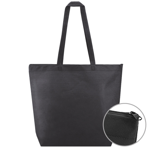 Es una bolsa muy amplia y muy cómoda con el cierre de cremallera, además al personalizarla con él anagrama de la empresa ha quedado muy bien.