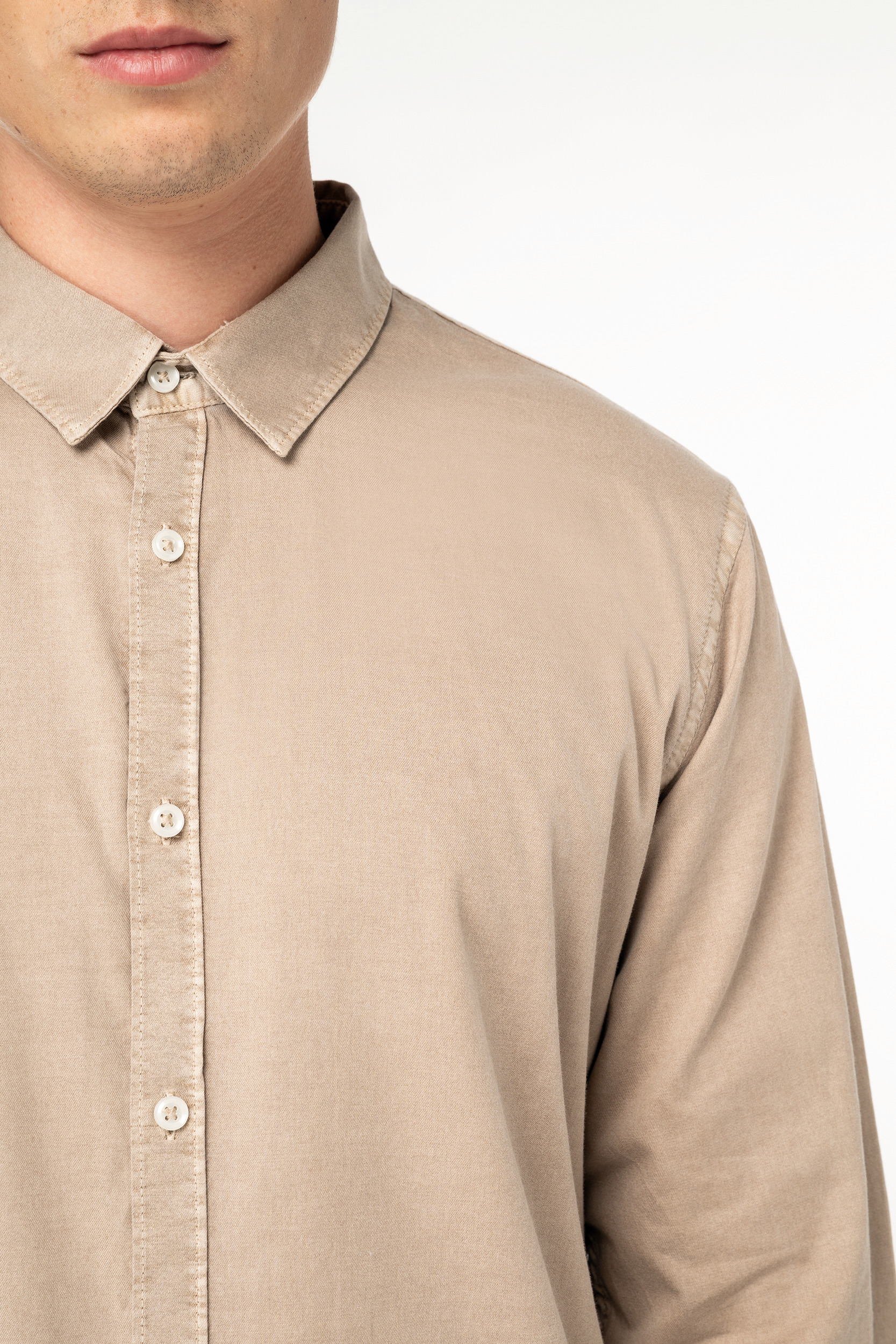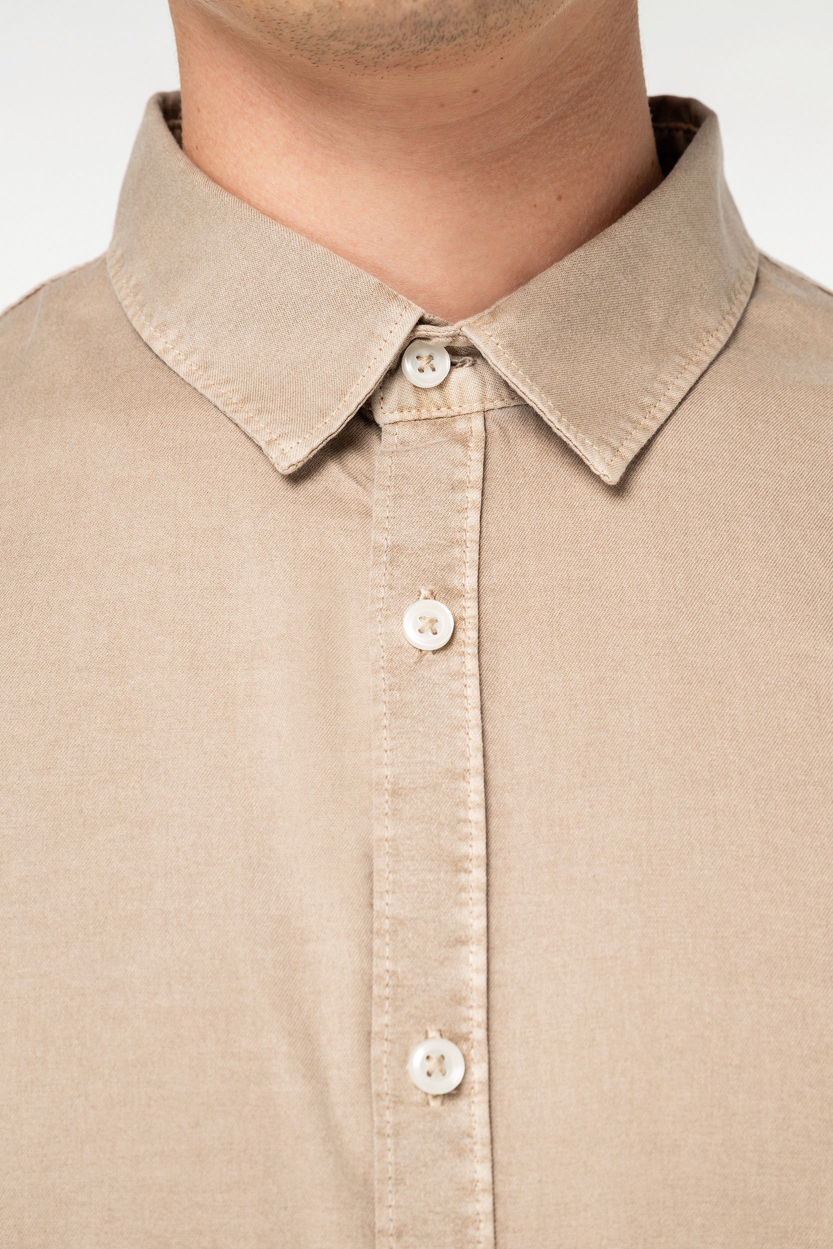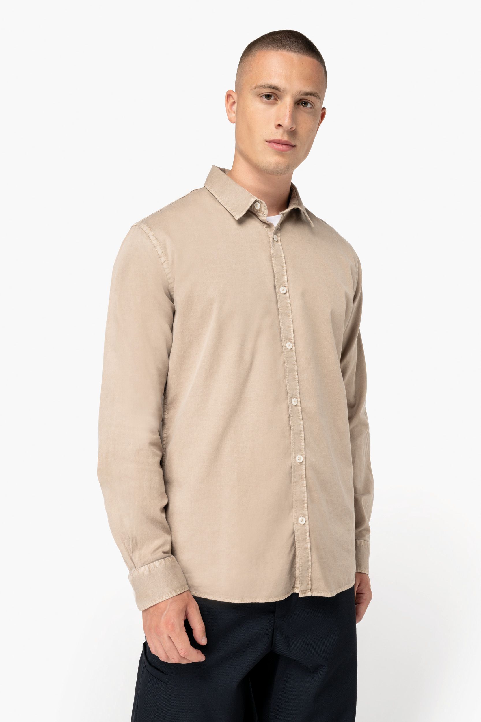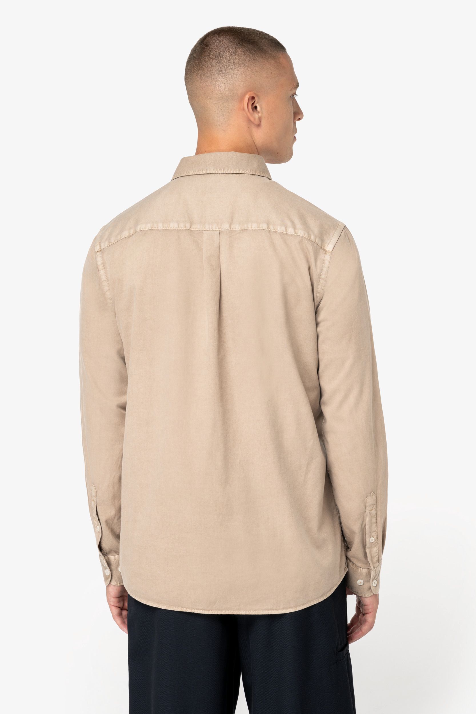 La camisa algodón orgánico hombre cuenta con una plaqueta de botonadura clásica y botones con efecto nacarado, que añaden un toque de sofisticación. El canesú en la espalda con pliegue redondeado holgado proporciona mayor libertad de movimiento, mientras que la plaqueta de botonadura en los puños permite un ajuste personalizado. Además, cada prenda es tintada después de su confección, lo que puede resultar en ligeras variaciones de color, haciendo que cada camisa sea única.