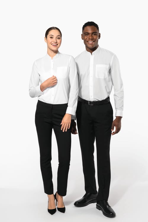La camisa cuello mao de mujer es la elección perfecta para quienes buscan una prenda que combine estilo y funcionalidad. Confeccionada con un tejido de 65% poliéster y 35% algodón, esta camisa ofrece un cuidado fácil y una durabilidad excepcional. El cuello mao añade un toque de sofisticación, mientras que los botones a tono y el bolsillo con acabado en v en el pecho izquierdo aportan detalles elegantes.