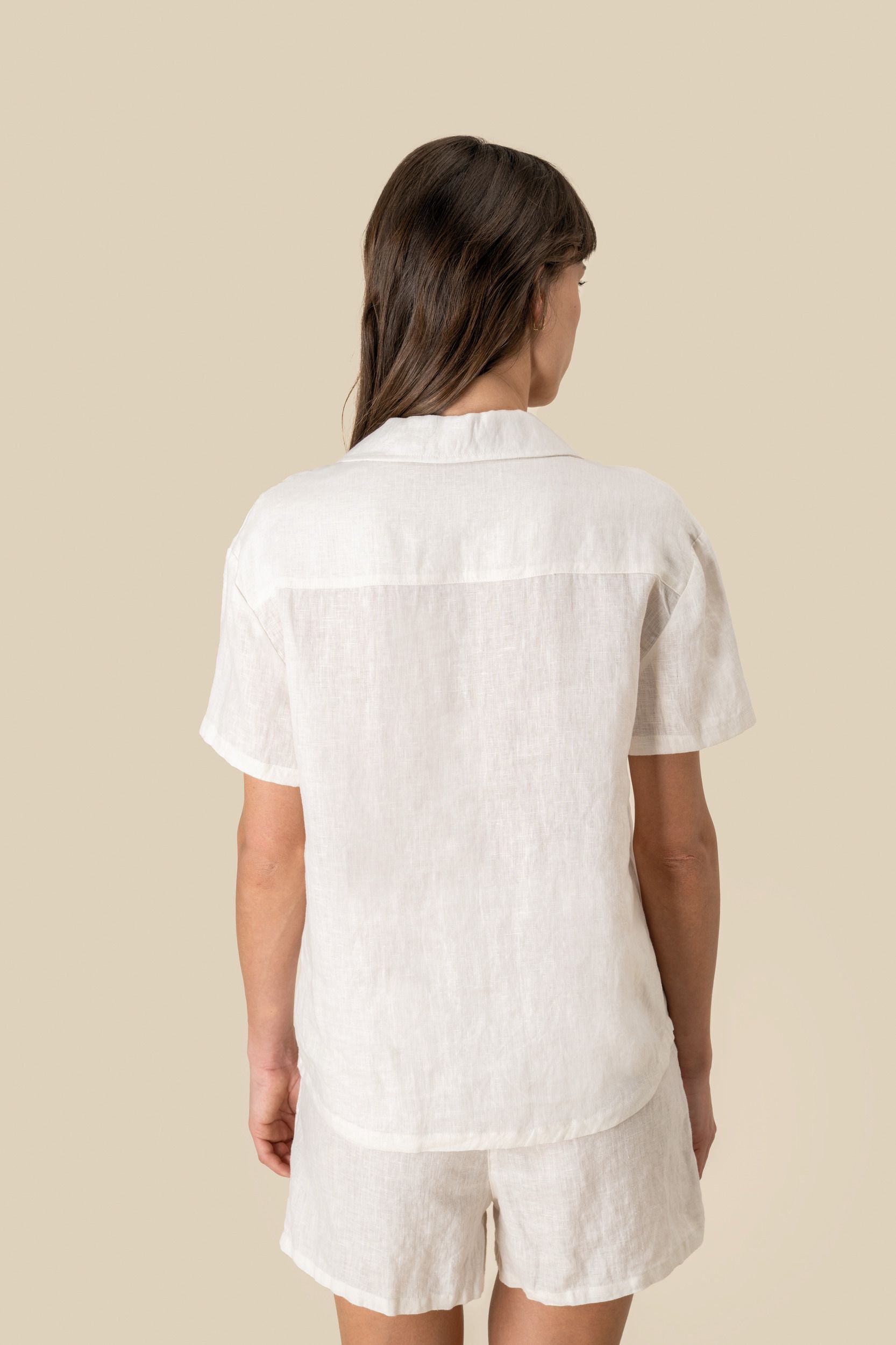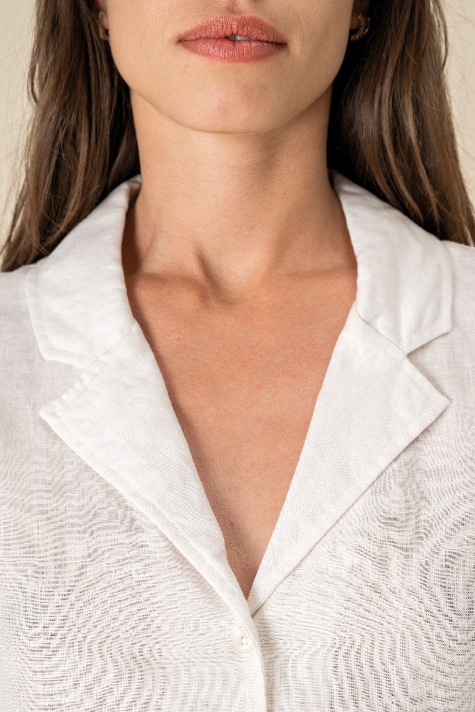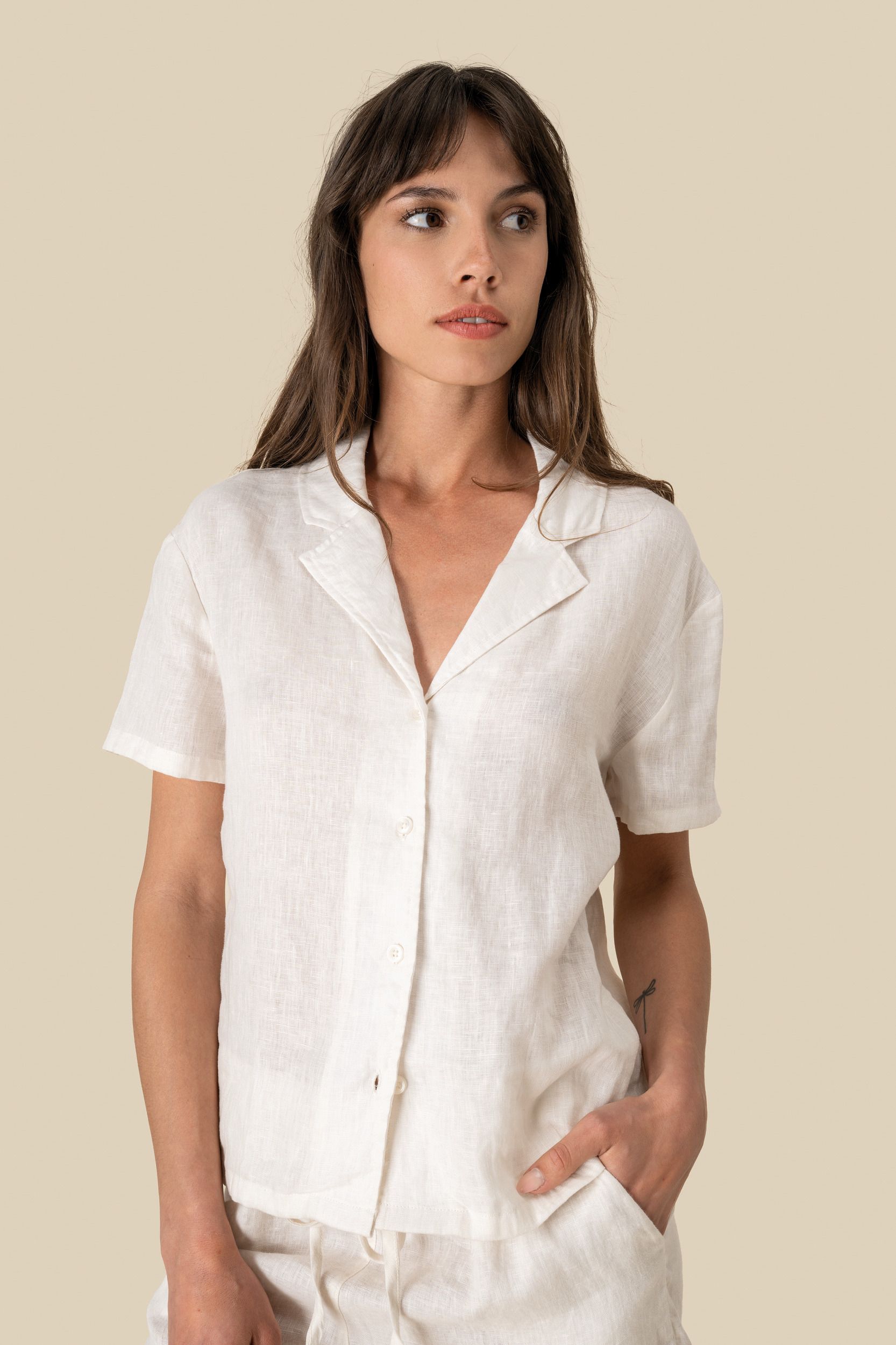 La camisa de lino manga corta para mujer es la prenda imprescindible para quienes buscan comodidad y elegancia en los meses más cálidos. Su tejido de 100% lino garantiza una sensación ligera y transpirable, perfecta para jornadas largas o escapadas de fin de semana. El corte regular se adapta a diferentes tipos de cuerpo, mientras que los colores ivory y organic khaki permiten crear combinaciones versátiles, desde un look casual hasta uno más sofisticado. El cuello bowling y la tapeta abotonada con botones de plástico reciclado de efecto nacarado aportan un toque moderno y sostenible, ideal para quienes valoran la moda responsable.