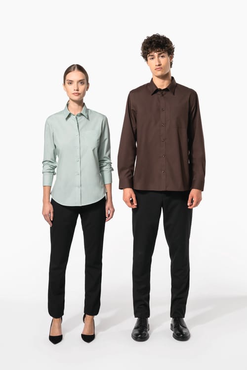 La camisa de polialgodón hombre combina lo mejor de dos mundos: la durabilidad del poliéster y la suavidad del algodón. Con un tejido de cuidado-fácil, esta prenda es ideal para quienes buscan practicidad sin sacrificar el estilo. El cuello cut-away y los botones a tono añaden un toque de elegancia, mientras que el bolsillo con acabado redondeado en el pecho izquierdo proporciona funcionalidad adicional.