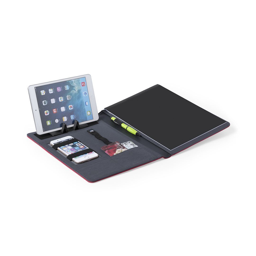 El interior de la carpeta está pensado para satisfacer todas las necesidades de organización. Con un soporte para tablet de hasta 10 pulgadas y un espacio dedicado para el smartphone, los dispositivos electrónicos están siempre seguros y accesibles. El bloc extraíble de 20 hojas con distribución a una raya y calendario es ideal para tomar notas rápidas o planificar el día a día, mientras que el soporte para bolígrafo asegura que siempre esté listo para escribir.