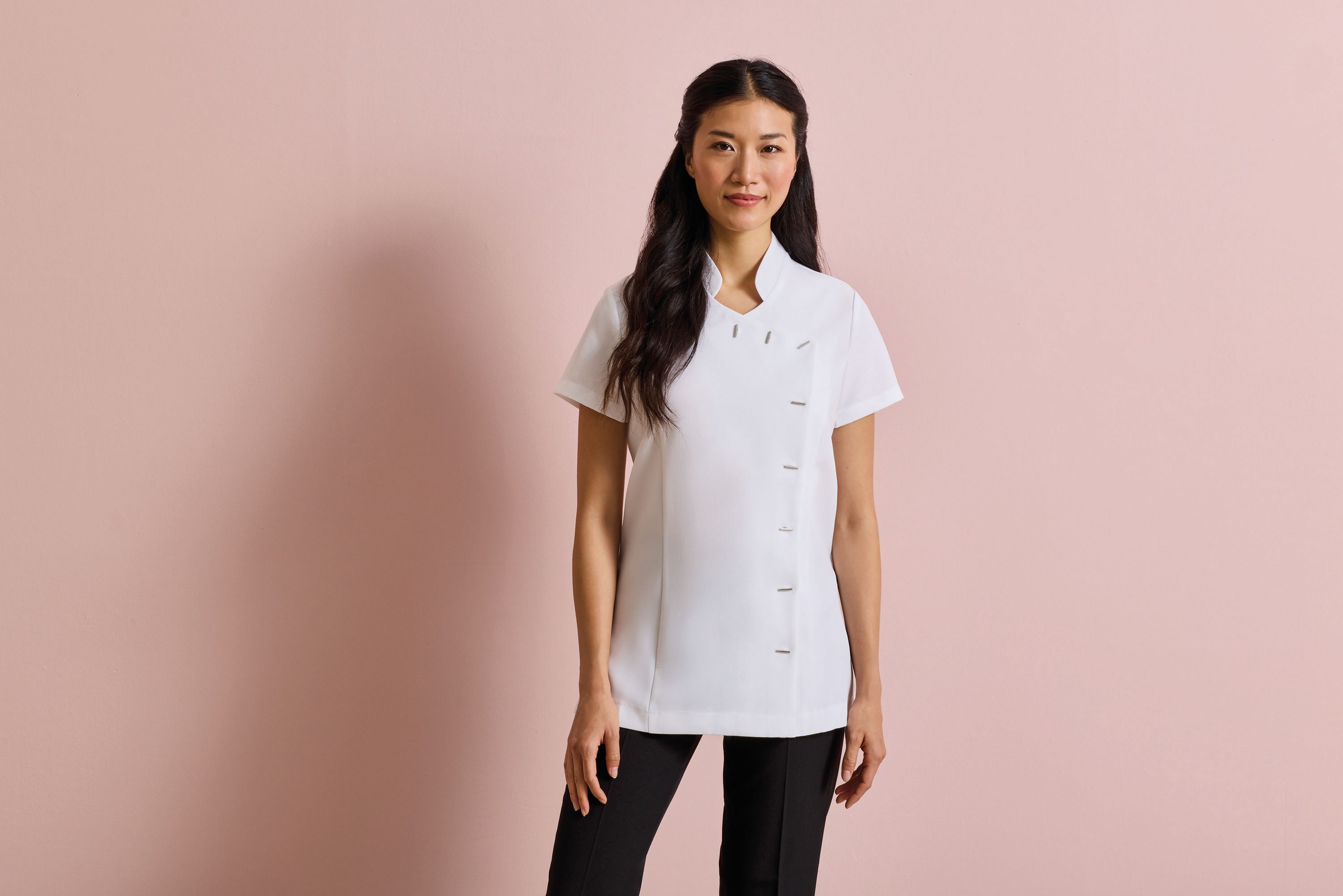 La casaca estética o spa es la elección perfecta para quienes buscan combinar elegancia y comodidad en su entorno de trabajo. Confeccionada en un tejido de 100% poliéster con efecto stretch, esta prenda garantiza una libertad de movimiento excepcional gracias a su pliegue en la espalda y aberturas laterales. Su diseño con cuello mao y sistema de botones asimétrico en la parte delantera añade un toque de sofisticación, ideal para centros de estética y spas.