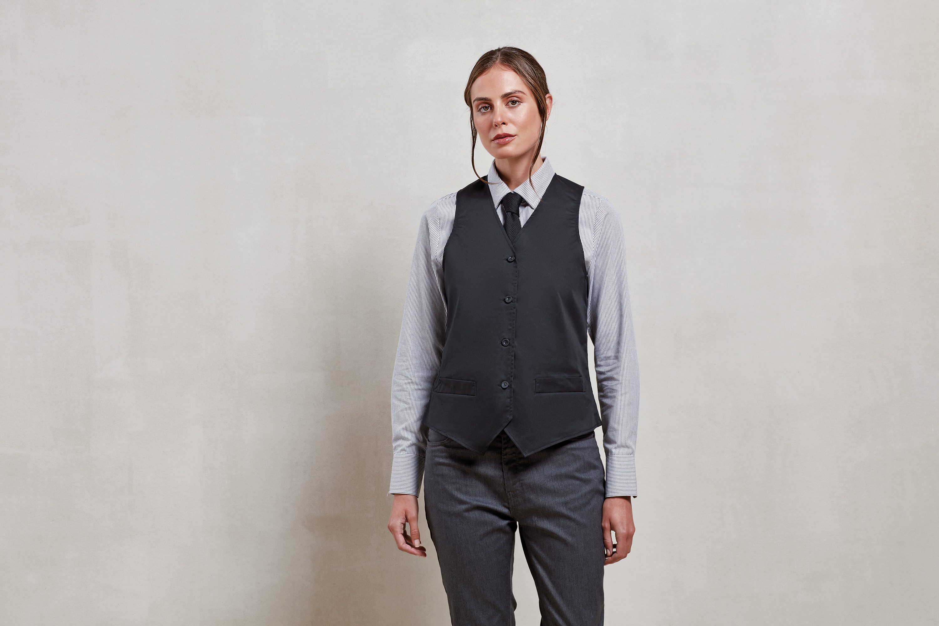 Este chaleco de camarera cuenta con dos bolsillos delanteros, ideales para llevar utensilios de trabajo o efectos personales. Su diseño permite un lavado doméstico a 60°c, lo que facilita su mantenimiento y asegura que siempre luzca impecable. Con un peso de 420 gramos, es ligero y cómodo para llevar durante largas jornadas laborales.