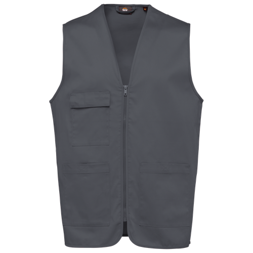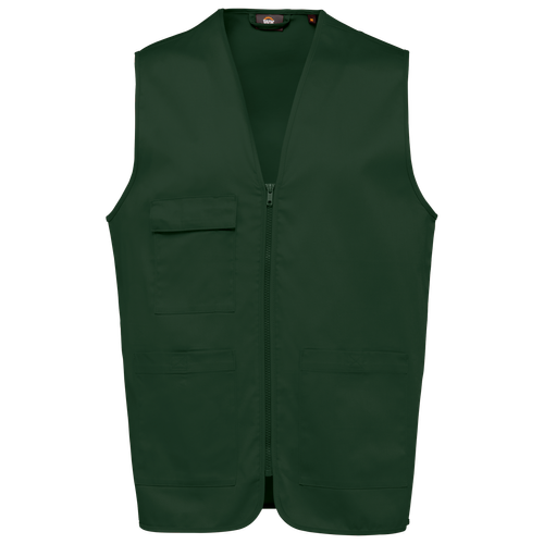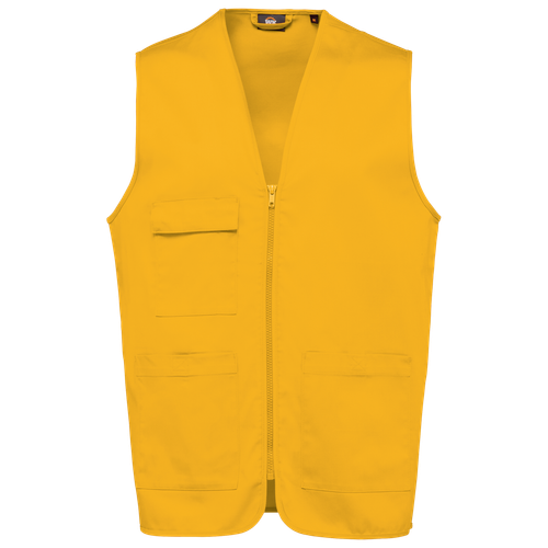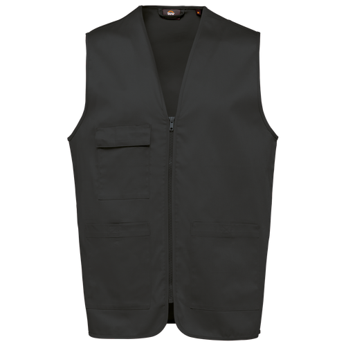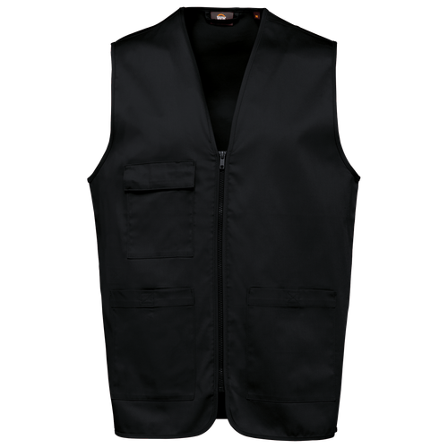 El chaleco polialgodón multibolsillos destaca por sus múltiples bolsillos, incluyendo dos bolsillos parche grandes en la parte delantera y un bolsillo en el pecho con compartimento para bolígrafo, lo que lo convierte en una opción práctica para profesionales y aficionados al aire libre. La presilla para colgar en la parte interior del cuello y la etiqueta para el nombre en el interior de la prenda añaden un toque extra de conveniencia. Además, el acabado en bies a tono en sisas y borde de la prenda garantiza una apariencia pulida y profesional.