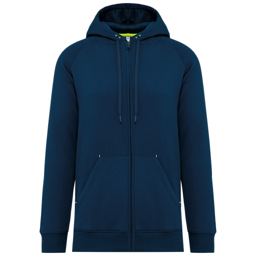 Esta chaqueta con capucha unisex no solo destaca por su diseño, sino también por sus detalles funcionales. El cierre con cremallera de nylon facilita su uso, y la capucha forrada de malla a tono añade un toque de estilo. El bolsillo canguro incluye un bolsillo fluorescente para el móvil, ideal para mantener tus pertenencias seguras y accesibles. Los ojales con cordón de ajuste en la capucha y el pespunte de refuerzo en los bolsillos aseguran una mayor durabilidad. Además, los puños y el bajo de la prenda en canalé de doble grosor 2x2 ofrecen un ajuste cómodo y seguro.