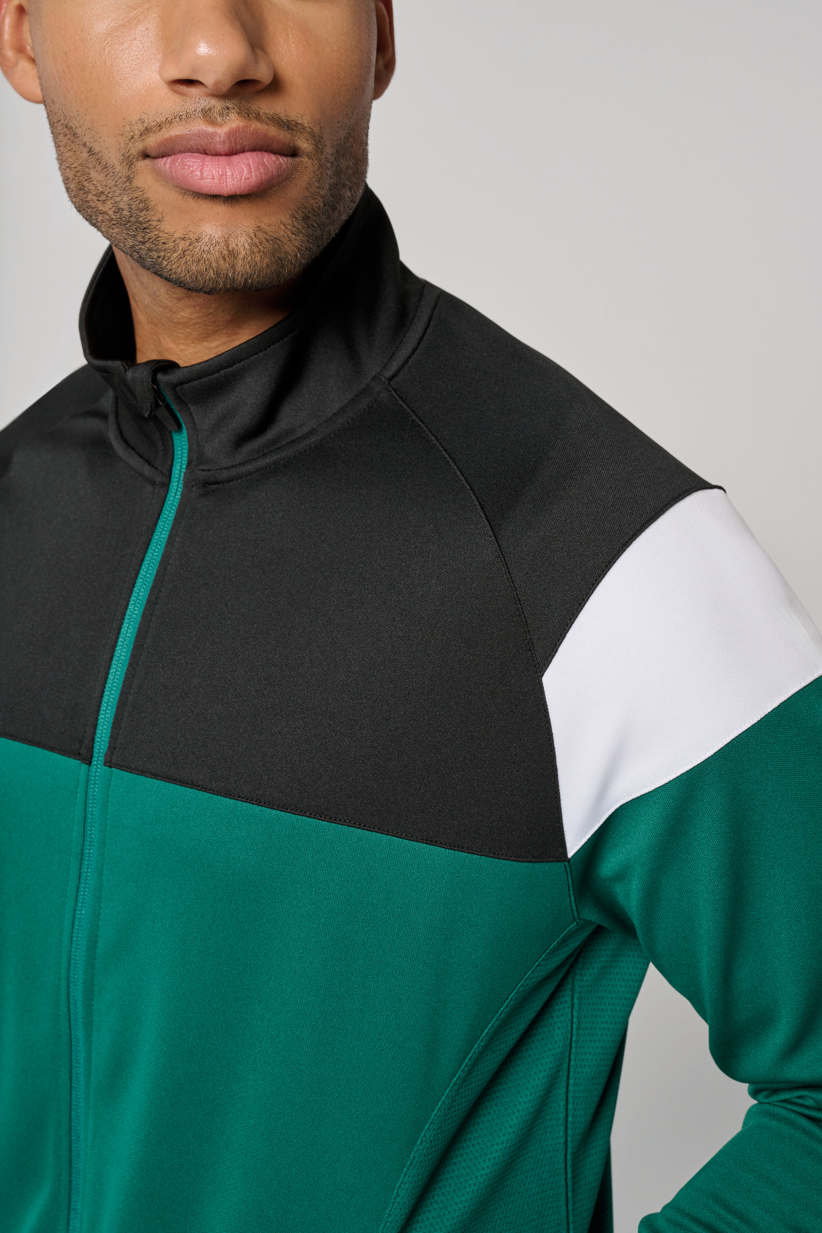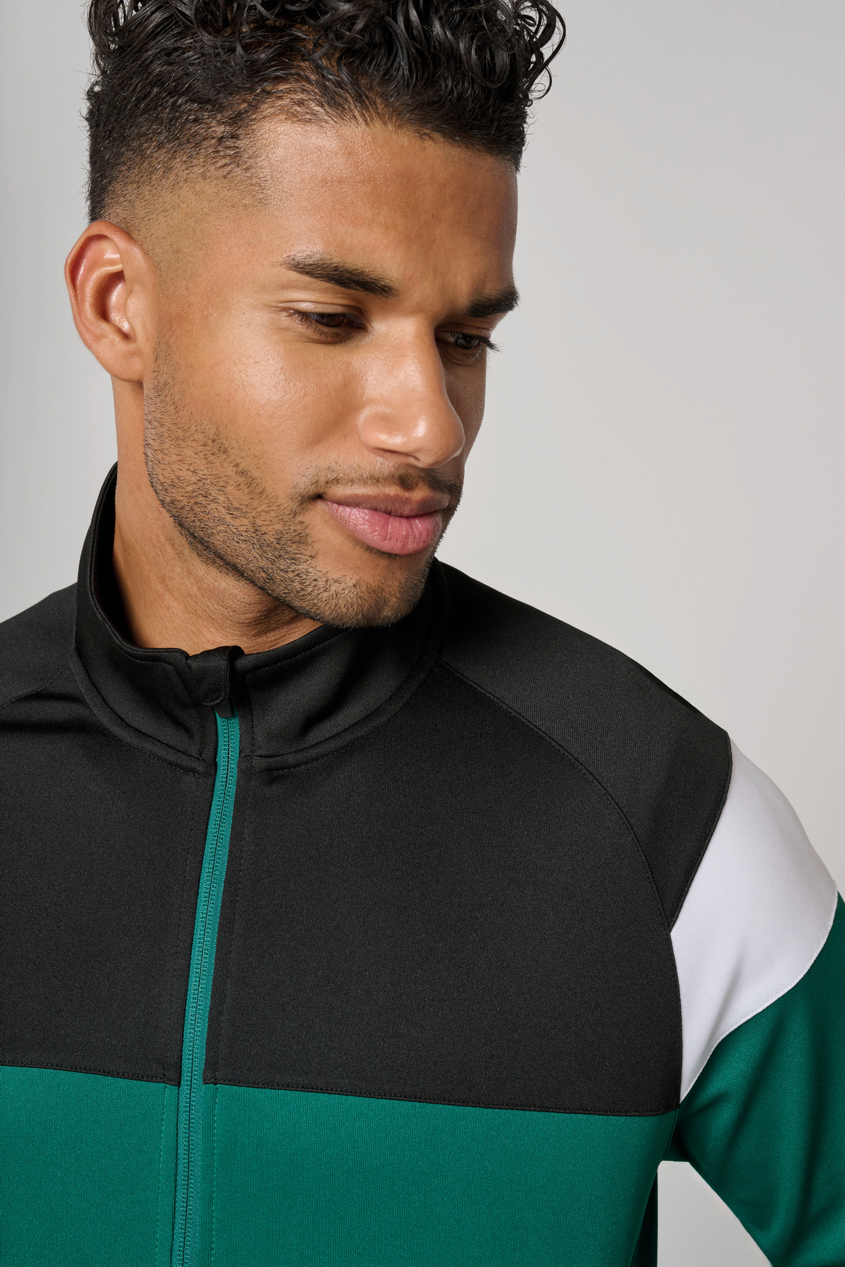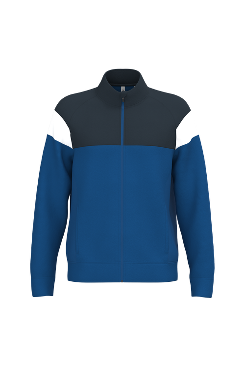 La chaqueta de chándal unisex está diseñada para ofrecer la máxima comodidad y estilo. Confeccionada en 100% poliéster interlock mate, esta chaqueta garantiza durabilidad y resistencia. Su corte recto y el cierre frontal con cremallera invertida de nailon a tono proporcionan un ajuste perfecto y seguro. Las mangas raglán con inserciones contrastadas en los hombros y los paneles a contraste en pecho y hombros añaden un toque moderno y deportivo.