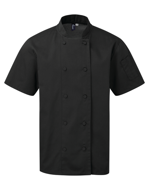 Diseñada pensando en la funcionalidad, la chaqueta de chef de manga corta cuenta con un doble bolsillo para bolígrafo en la manga izquierda, ideal para tener siempre a mano las herramientas esenciales. El cuello mao proporciona un aspecto profesional y moderno, mientras que el panel central de la espalda, confeccionado con tejido coolchecker®, asegura una gestión óptima de la humedad, manteniendo al chef fresco y seco. Disponible en colores clásicos como negro y blanco, y en una amplia gama de tamaños desde xs hasta xxl, esta chaqueta es perfecta para cualquier profesional de la cocina.