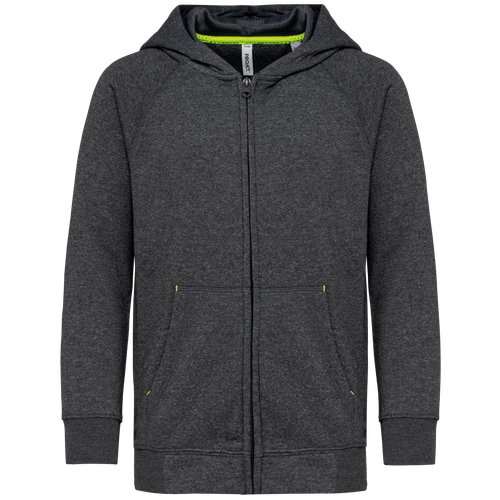 Esta chaqueta infantil con capucha cuenta con un corte ajustado y mangas raglán que permiten una mayor libertad de movimiento. El cierre con cremallera de nylon facilita el uso, y la capucha forrada con malla a tono añade un toque de estilo. Los bolsillos tipo canguro, incluyendo un bolsillo para teléfono fluorescente, ofrecen espacio adicional para guardar pequeños objetos. Los puños y el bajo de la prenda en canalé de doble grosor 2x2 aseguran un ajuste perfecto y duradero. Además, el acabado de media luna en la parte posterior del cuello facilita la personalización de la prenda, haciendo de esta chaqueta una opción versátil y práctica para cualquier niño.