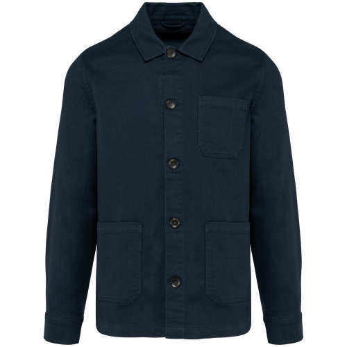Esta chaqueta cuenta con una tapeta y puños con botones de tipo cuerno, así como un bolsillo de parche en el pecho y dos bolsillos adicionales en la parte inferior, todos con pespunte de refuerzo en las esquinas. El cuello elegante y los puños con botones de plástico reciclado añaden un toque de sofisticación. Además, el forro de la parte superior incluye un parche de personalización de algodón a tono, lo que permite una personalización fácil y rápida. El efecto lavado y la ausencia de etiqueta de marca en el cuello hacen que cada chaqueta sea única y especial.