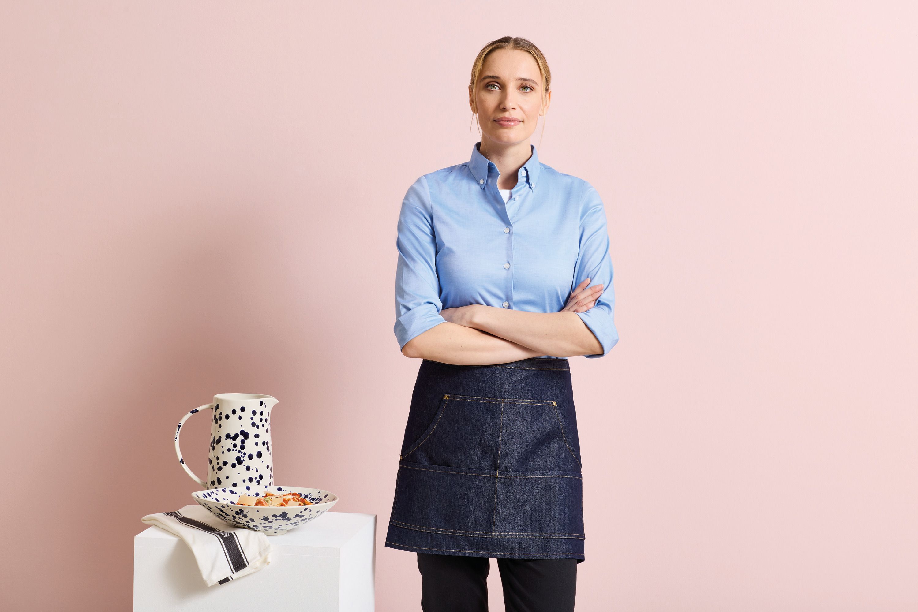El delantal denim de sarga es la elección perfecta para aquellos que buscan una combinación de durabilidad y estilo. Confeccionado con un 70% de algodón y un 30% de poliéster, este delantal ofrece una resistencia excepcional y una comodidad inigualable. Sus costuras contrastadas y remaches de cobre no solo añaden un toque de elegancia, sino que también garantizan una mayor durabilidad. Ideal para chefs, baristas y cualquier profesional que necesite un delantal resistente y con estilo.
