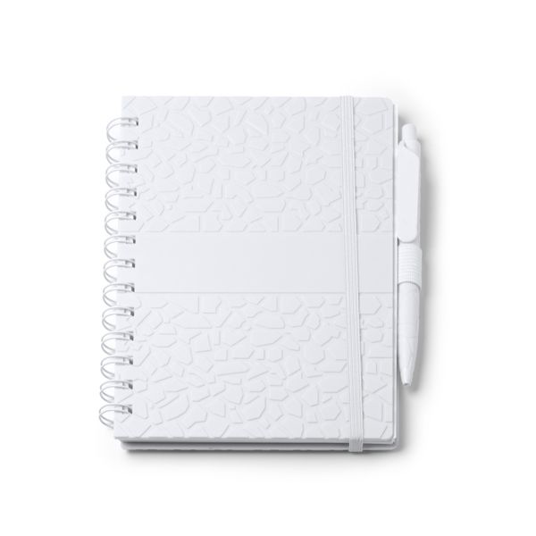 La libreta a5 wire-o con tapa rígida destaca por su fabricación con extractos de piedra, un material innovador que aporta resistencia y durabilidad, además de ser respetuoso con el medio ambiente. Su diseño en color blanco y formato compacto la convierten en la opción ideal para profesionales, estudiantes y creativos que buscan una libreta práctica y elegante para el día a día. El sistema wire-o de doble anilla permite abrir la libreta completamente, facilitando la escritura en cualquier superficie y aprovechando al máximo cada una de sus 70 hojas a rayas.