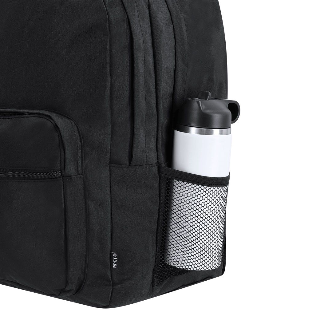 Con múltiples compartimentos, la mochila ecológica rpet 15" ofrece una organización excepcional. Los dos bolsillos centrales con cierre de cremallera de doble tirador y los bolsillos frontales facilitan el acceso a objetos de uso frecuente. Además, el bolsillo lateral de rejilla y la cinta superior añaden funcionalidad extra para llevar botellas de agua o accesorios adicionales. Presentada en una bolsa individual reciclada, esta mochila es la elección inteligente para quienes buscan estilo, comodidad y responsabilidad ambiental en un solo producto.
