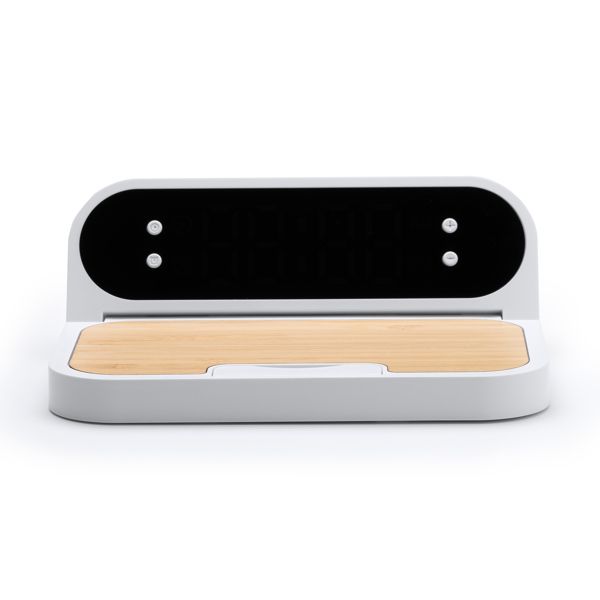 El reloj cargador inalámbrico con alarma y soporte plegable es la solución perfecta para quienes desean optimizar su espacio y simplificar su rutina diaria. Gracias a su superficie de carga en bambú y estructura de abs, este producto combina resistencia y diseño moderno, adaptándose a cualquier ambiente. Su potencia de 10w permite cargar dispositivos compatibles de forma rápida y segura, mientras que el indicador luminoso de carga facilita el seguimiento del proceso. El color blanco y el tamaño compacto lo convierten en una opción ideal para escritorios, mesitas de noche o espacios de trabajo.
