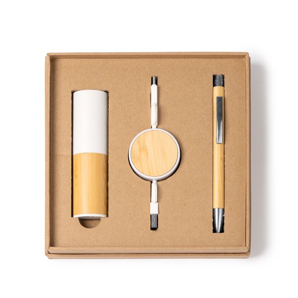 Este set de batería, cargador y bolígrafo destaca por su presentación en caja de diseño eco, convirtiéndolo en un regalo elegante y responsable. El bolígrafo de bambú con tinta azul añade un toque natural y sofisticado, perfecto para quienes buscan productos funcionales y respetuosos con el medio ambiente. Es una opción económica y versátil, pensada para quienes desean estar siempre conectados y preparados, ya sea en la oficina, la universidad o durante sus desplazamientos diarios. Una solución completa que une tecnología, sostenibilidad y estilo en un solo producto.