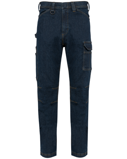 Este vaquero destaca por su funcionalidad gracias a sus múltiples bolsillos. En la parte delantera, cuenta con dos bolsillos de abertura inclinada y un bolsillo con costuras reforzadas y cierre de velcro en el lado izquierdo. En el lado derecho, incluye un pasador para martillo y un bolsillo para metro. La parte trasera presenta dos bolsillos parche con costuras reforzadas, uno de ellos con solapa y cierre de velcro. Además, la cintura redondeada con tira elástica antideslizante y las pinzas de holgura en las rodillas proporcionan una sujeción óptima y mayor confort. El refuerzo en la entrepierna y los triples pespuntes en las costuras laterales y traseras aseguran una excelente resistencia y libertad de movimiento.